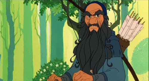 Visually, two things struck me as I watched the movie this time. For one thing, I found myself noticing how similar the animation was in this Rankin/Bass cell animated film to Rankin/Bass's stop motion films, like their well known Christmas specials of the 60s and 70s. And I noticed the film's beautiful design--even this anonymous hunter at the beginning has a fabulous, curly art nouveau beard;