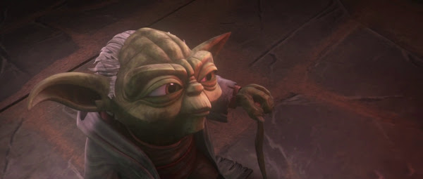 Unfortunately, the arc demonstrates how the people working on Clone Wars, including George Lucas, really didn't understand Yoda as he is in Empire Strikes Back. Although Yoda does leave his lightsabre pointedly behind on one of his trials, a part where he must face both the temptation of war and the temptation of serenity rather blatantly shows the level of understanding the writers have for the two concepts--the temptation of war is a shadowy version of Yoda that wrestles with him, the temptation of serenity is a vision of all of Yoda's deceased friends alive again and his enemy, Dooku, rejoined with the Jedi in a peaceful temple courtyard scene. Yoda seems happy before rejecting it as a lie.