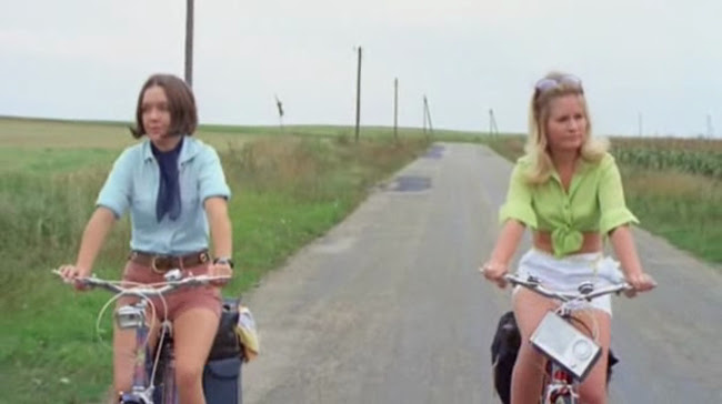 In all this empty space, these desolate stretches of road between isolated villages, the two young women stop to rest by a little patch of woods where a girl just like them had been raped and murdered a few years ago, something Jane (Pamela Franklin) learns much later. After a little while, Jane wants to move on but Cathy (Michele Dotrice) wants to stay and doze a bit longer. Somehow this turns into a big fight--and a line I suspect was improvised as Jane, moving her bike, says, "Get your great fat legs out of the way!" and Cathy can't suppress a grin. But in any case, the girls separate, Jane goes on to the next village and Cathy says she'll catch up. Of course, she never does.