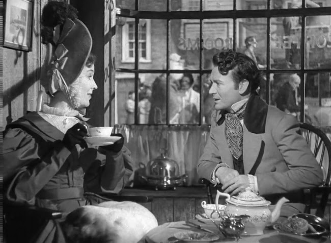 I read an essay by Jay Clayton included with a 1996 edition of the book that in part argues that Lean's focus is much more on the relationship between Pip and the convict, Magwitch; that the heart of the story in Lean's film is that relationship. I certainly agree. There's little of the moral anguish Pip feels about Joe who is here employed for comic relief more than anything. Bernard Miles as Joe drops his hat in the tea when when he visits the gentlemen, Pip and Herbert, a piece of physical comedy much broader than anything that occurs in the book.