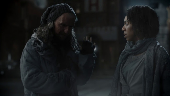 If this regeneration at the beginning is only a tease, it would be the second one this season, which leads me to think it's not. I'm more impressed with Capaldi's hair, though, which almost looks full Pertwee. It's appropriate we see him using Venusian Aikido in this episode. I also liked the Doctor calling out Bill for moralising while eating a ham sandwich, perhaps confirming that one of the few things I liked about the Sixth Doctor era, the Doctor becoming a vegetarian, is still true.