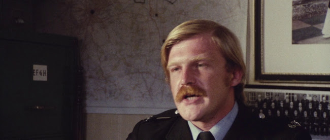 The film has other problems. It seems to choose as protagonist an American photographer named Jill Travers (Mimsy Farmer) who's visiting the English village where the film takes place to take pictures of an old crypt. She's brought in to photograph crime scenes as the only photographer available in the small town and she starts taking an interest in the case. Unfortunately, the filmmakers apparently decided this role was too big for a woman so a smug inspector from Scotland Yard named Gorley (David Warbeck) is introduced to solve problems and make out with her. The local law enforcement is represented by a Sergeant Wilson (Al Cliver) who has a distractingly asymmetrical moustache.