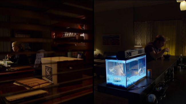 The months pass in split screen and we see Kim (Rhea Seehorn) and Jimmy (Bob Odenkirk) diverge in careers and lifestyle even as they continue to live and sleep together. It's nicely done, like watching Kane and his wife gradually sitting further apart at the breakfast table in Citizen Kane. Jimmy goes from putting the paste on Kim's toothbrush to not even eating with her.