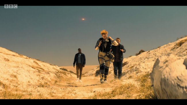 Everyone still talks fast but I perceive a general slowing of pace along with the simpler plotting that I find refreshing. The Doctor and her companions encounter two aliens competing with each other in a race across a desert planet and the story between those aliens is established nicely. They come off a lot better than the Doctor's companions, actually. Yasmin (Mandip Gill) cramming in some exposition about how her dad drives her bananas and her sister's trying to get her to move out felt really stiff and made clear a problem with the Doctor having three companions in the new series; we learned next to nothing about Ian and Barbara's families. With the imperative in the new series that we go back to the more domestic focus of the Russell T. Davies era, but without the one on one relationship between the Doctor and companion, it feels overstuffed. It wasn't helped by the fact that all three companions seemed to deliver their lines without much inflection in this episode.