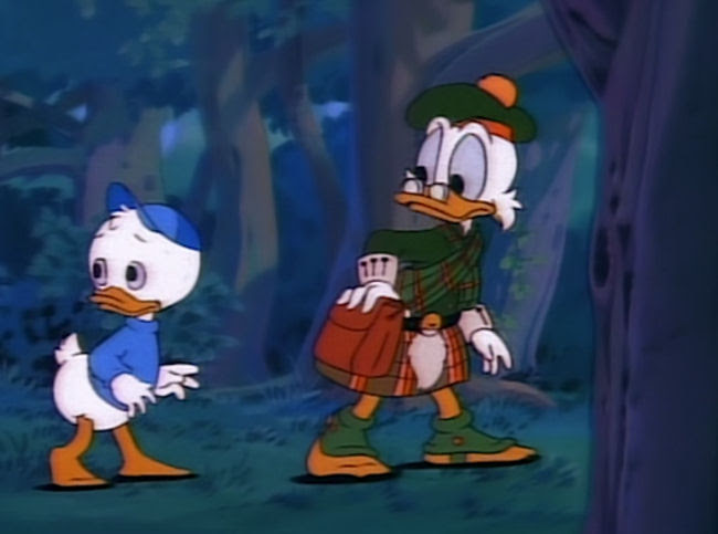The other ducklings have some funny lines, too. When Scrooge proudly changes into his kilt, he says, "All the McDucks used to dress this way." Huey remarks, "No wonder dogs kept chasing them."