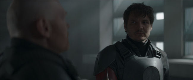 Of course, driving a truck on uneven ground with volatile explosives doesn't make much sense when there are hover cars and ships that can take them. The episode's biggest flaw is its many glaring logical problems, the biggest being the facial scan Din is required to undergo to access an Imperial terminal. Storywise, it's good to have a reason to put Din in this position--where he has to choose between keeping his helmet on and saving Grogu--but it doesn't make sense that he would need a facial scan when apparently it doesn't matter at all to the computer if his face is in the records as an Imperial officer or trooper. Famuyiwa is one of those people who evidently doesn't think this kind of thing matters but of course it does--the crucial thing here is Din's motivation and if his motivation doesn't make sense it seriously undercuts everything. We have to have a clear idea of the stakes he's weighing in his head.